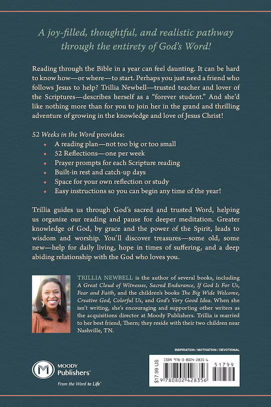 52 Weeks in the Word guides you through God's sacred Word, all while helping you organize and pause for deeper meditation. You'll discover treasures--some old, some new--help for daily living, hope in times of suffering, and a deep abiding relationship with the God who loves you.
